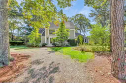Welcome to this beautifully maintained 3-bed, 2.5-bath contemporary home on a corner lot in desirable John's Pond Estates. Step into the dramatic foyer with a soaring ceiling that sets the tone for the light-filled interior. The spacious living room features high ceilings, abundant natural light, and sliding glass doors that open to a deck with peaceful water views. A formal dining room flows into a well-appointed kitchen with easy access to the two-car garage. The first-floor primary suite adds convenience with an en suite bath, in-unit laundry, and private deck just steps from the outdoor shower. Upstairs, you'll find two generously sized bedrooms and a full bath, perfect for guests or family. The full-sized, unfinished basement provides ample storage space and the potential to be converted into additional living space. The level yard offers space to relax, garden, or entertain—all just a short stroll to John's Pond with its clear waters and association beach access. Whether you're seeking a year-round home, summer retreat, or investment, this property checks all the boxes in one of Mashpee's most sought-after neighborhoods.
